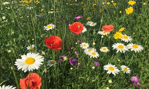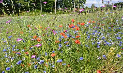 Närbild på klätt, vallmo och blåklint, juli 2017