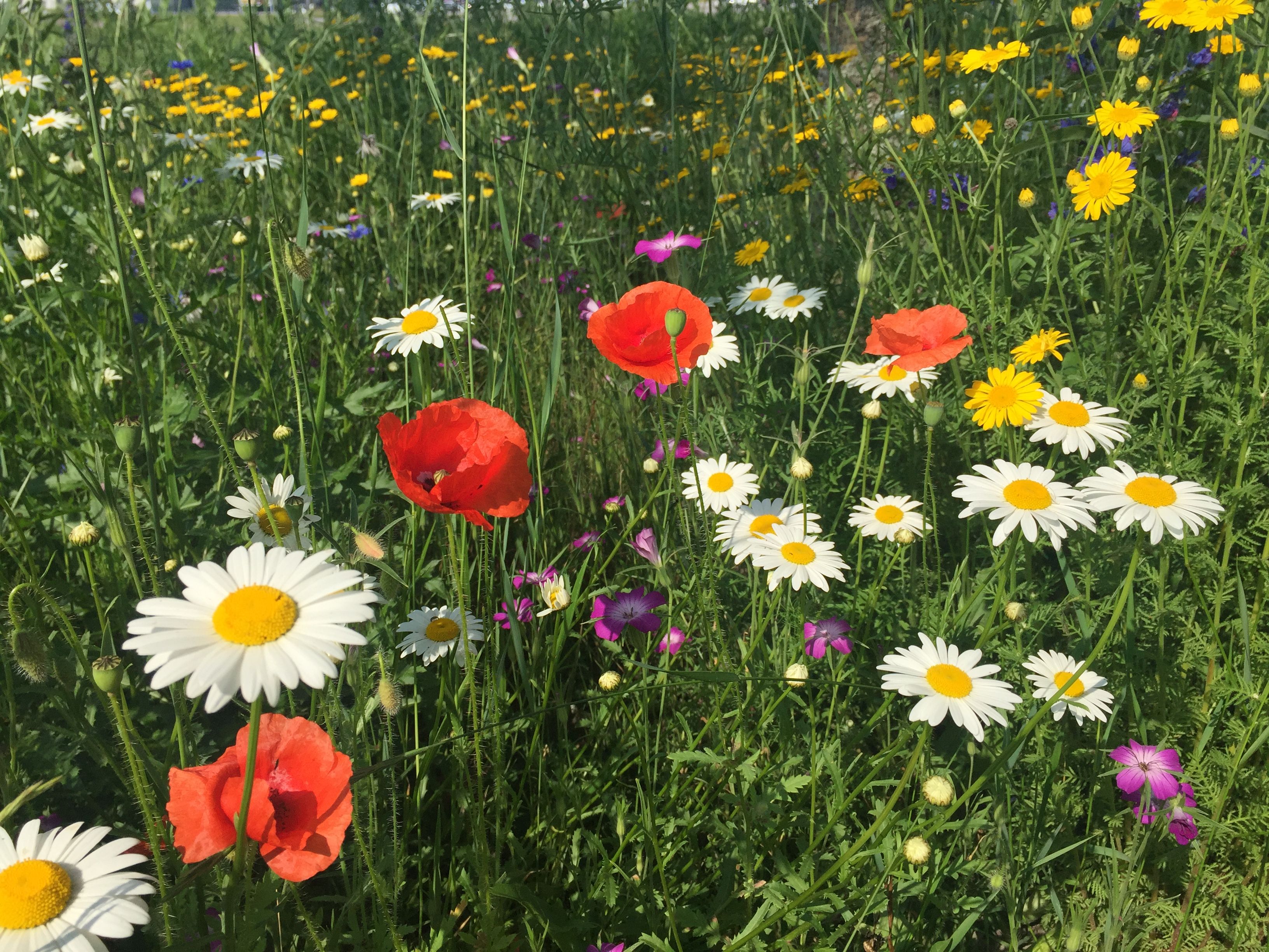 Närbild på klätt, vallmo och blåklint, juli 2017